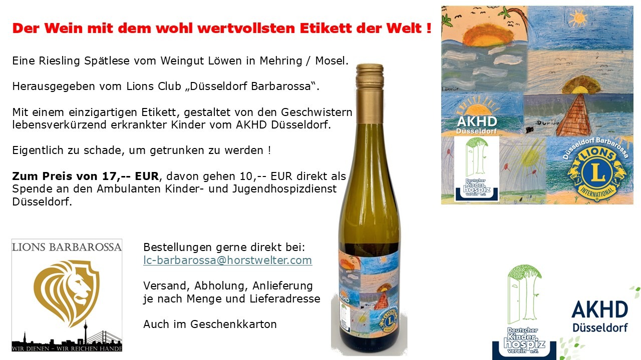Der Lions Club Düsseldorf Barbarossa bietet einen hochwertigen Riesling in exklusiver Flasche vom Weingut Löwen aus Mehring / Mosel an. Das Etikett wurde von Geschwisterkindern vom AKHD Düsseldorf gestaltet, die…